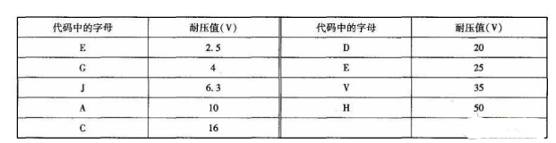 ?、凼褂么a法,通常由一個字母和三個數(shù)字組成,字母表示電解電容的耐壓值,數(shù)字用來標(biāo)明電容量,單位為pF。前兩位數(shù)字表示電容量的有效數(shù)字,第三位數(shù)字表示有效數(shù)字乘以10的冪次。貼片電解電容上面的指示條標(biāo)明此端為電解電容的正極。貼片電解電容代碼中的字母與耐壓值的關(guān)系見下表。